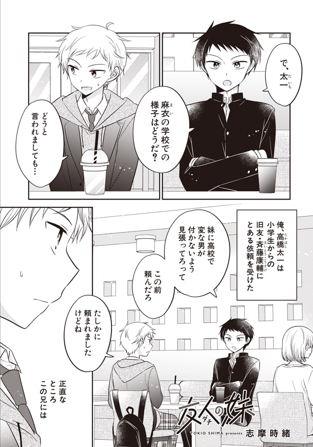 「友人の妹」は、小学生の頃からの友人・斉藤康輔に「妹に高校で変な男が付かないよう見張ってろ」と頼まれるも、その妹と恋人同士になってしまった男子・高橋太一が主役のラブコメ作品。同作は楽園の夏のWeb増刊と夏増刊にも掲載されていた。