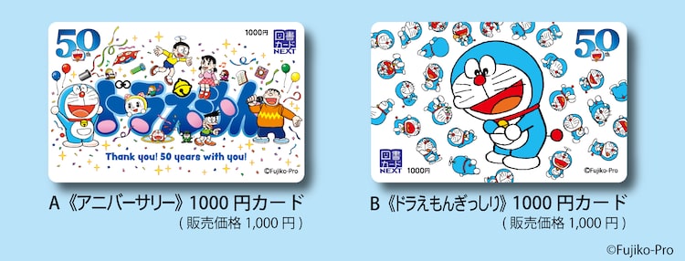 カードは「ドラえもん」50周年を記念したデザインの2種類。中央にタイトルロゴを大きく配し、のび太をはじめとしたキャラクターたちを描いた「アニバーサリー」と、さまざまな姿のドラえもんを所狭しとプリントした「ドラえもんぎっしり」が用意された。どちらも1000円分で、購入者には台紙と外袋をプレゼント。カードの告知ポスターが掲出された書店では、予約や販売を行う予定だ。詳細は各書店に問い合わせよう。