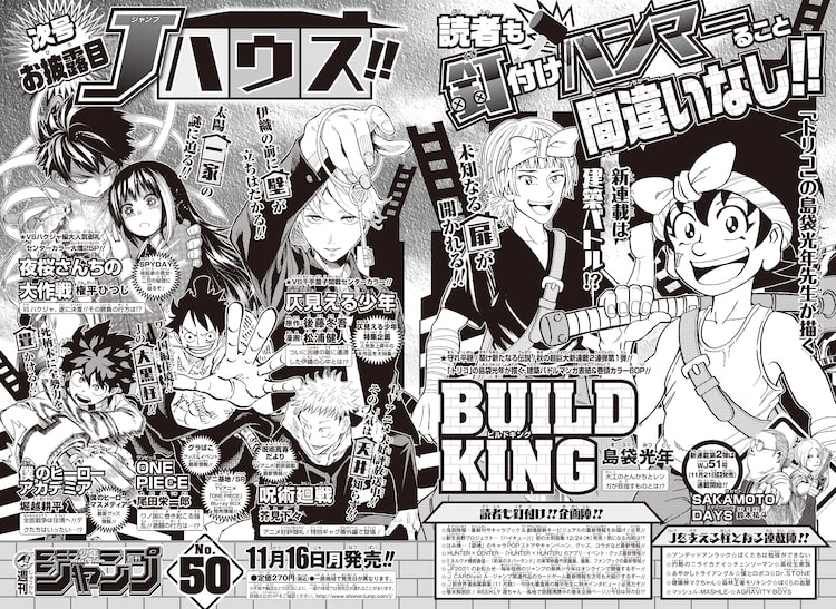 2018年にも同名の読み切りを週刊少年ジャンプで発表した島袋。本日11月9日に発売された週刊少年ジャンプ49号の予告ページには、「新連載は建築バトル!?」「大工のとんかちとレンガが目指すものとは!?」といった煽りや予告文とともに「BUILD KING」のカットが掲載された。第1話は表紙と巻頭カラー60ページで登場する。なお島袋がジャンプで連載するのは2016年11月の「トリコ」完結以来、約4年ぶりのこと。