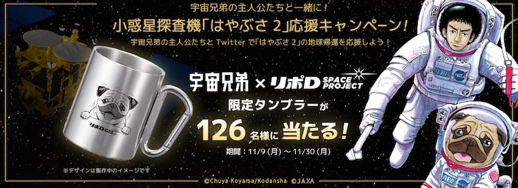 宇宙開発を目指してがんばる人々を応援する大正製薬のプロジェクト「リポD SPACE PROJECT」の一環として、これまでにもコラボ企画を展開してきた大正製薬と「宇宙兄弟」。今回ははやぶさ2のカプセルの地球帰還予定日12月6日にちなみ、応募者の中から抽選で126人に「『宇宙兄弟×リポD SPACE PROJECT』限定タンブラー」をプレゼントする。希望者はプロジェクト公式のTwitterアカウント(@Lipod_Utyu)をフォローのうえ、キャンペーンツイートからはやぶさ2を一緒に応援したいキャラクターを1人選び、ツイートしよう。