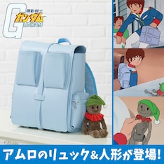 「アムロのリュックサック」「アムロの人形 マスコットポーチ」はアニメ第13話「再会、母よ・・・」にて、アムロが持っていたアイテムをイメージしたもの。「アムロのリュックサック」は独特な四角い形状や目立つ位置に取り付けられているポケットを合成皮革を使用して再現。「アムロの人形 マスコットポーチ」では、アムロの実家に飾ってあった思い出のつまった木製の人形が、ポリエステル生地を使用した柔らかいマスコットポーチ仕様に。ボールチェーン付きになっており、リュックサックなど好きな場所に付けて持ち運ぶこともできる。