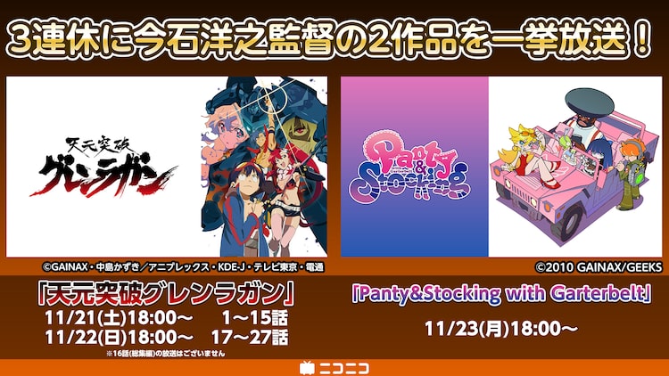 今石洋之が監督したTVアニメ「天元突破グレンラガン」「Panty & Stocking with Garterbelt」の一挙放送が、11月21日から23日の3連休にかけてニコニコ生放送で行われる。