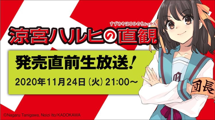 いとうのいぢがイラストを手がける谷川流の小説「涼宮ハルヒの直観」が11月25日に発売。約9年半ぶりとなるシリーズ最新巻の刊行を記念して、発売前日となる11月24日にアニメ版のキャストが出演する番組がニコニコ生放送で配信される。