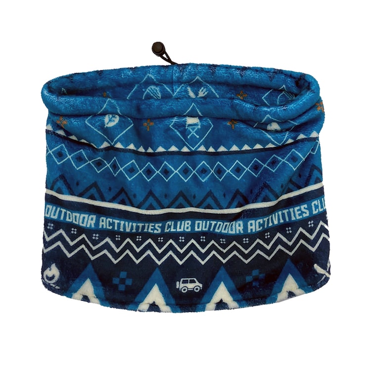 ネックウォーマーには焚き火、キャンプチェア、カトラリーなど、キャンプに関するモチーフをデザイン。素材にはポリエステルが使われており、ふわふわした肌触りに仕上げられた。