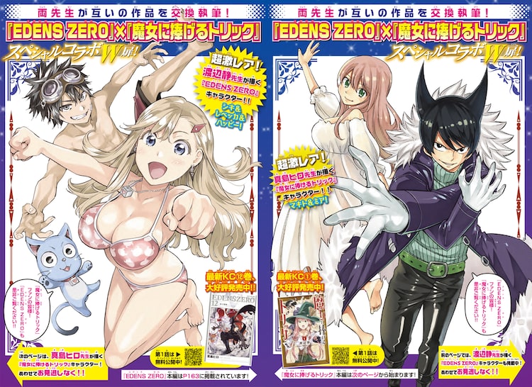 真島ヒロ「EDENS ZERO」と、渡辺静「魔女に捧げるトリック」がコラボレート。本日12月2日発売の週刊少年マガジン2021年1号(講談社)に、互いの作品を描いたイラストが掲載された。