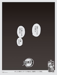 完結巻は明日発売「鬼滅の刃」広告が本日の全国紙夕刊に、産屋敷耀哉のセリフ使用 2020年12月3日2020年12月3日 editor 「鬼滅の刃」の「完結巻記念全面広告」。吾峠呼世晴「鬼滅の刃」の「完結巻記念全面広告」が、本日12月3日に読売新聞、朝日新聞、毎日新聞、日本経済新聞、産経新聞の夕刊に掲載される。産経新聞は大阪発行分のみ。 明日12月4日に完結巻である23巻が発売される「鬼滅の刃」。広告では同作に登場する鬼殺隊の長・産屋敷耀哉のセリフ「永遠というのは人の想いだ 人の想いこそが永遠であり 不滅なんだよ」が使われ、作品に込められた思いが表現されている。 (c)吾峠呼世晴/集英社 関連記事「ドンケツ season2」YouTubeで1話を無料公開、まさかの神奈川県警察コラボも稚野鳥子の新連載「セカンドハーフガールズ」人生後半戦からの幸福論コメディ「トリツカレ男」水樹奈々が歌うように話す、ペチカと母の会話シーンを公開“いい子”演じちゃうOLと自由奔放な男子高校生がふらっと海に向かうポラリス読切萩尾望都の秘蔵スケッチが画集に、第1巻は「ポーの一族」などに関わる約170点収録「魔法科高校の劣等生」インベージョン編のコミカライズ1巻、小説26巻のエピソード Tweet 関連コミック 鬼滅の刃
