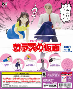 コップのフチなどでポーズを決めるキャラクターのフィギュアを多数リリースする「PUTITTO」シリーズは、「コップのフチ子」で知られる奇譚クラブのフィギュアレーベル。「PUTITTO ガラスの仮面」では真澄がマヤを挑発して公衆の面前で劇中劇「忘れられた荒野」のジェーンの演技をさせる「北島マヤ(ううー)」と「速水真澄(さあこい!ジェーン!)」に加え、「姫川亜弓(くやしい…!くやしい…!)」「月影千草(オーホホホホホおそろしい子!)」「鷹宮紫織(私が連れていってあげる…)」の5種がお目見えした。またシークレット1種もラインナップされている。