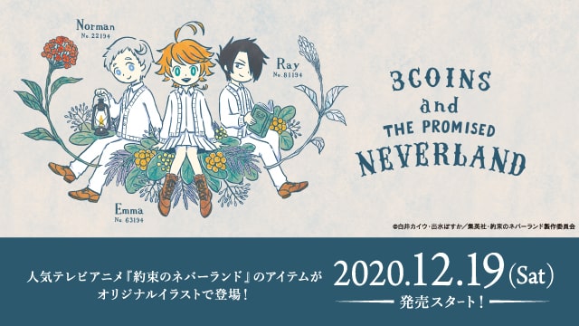 白井カイウ・出水ぽすか原作によるTVアニメ「約束のネバーランド」と3COINSのコラボアイテムが、12月19日より全国の3COINS全店で発売開始される。