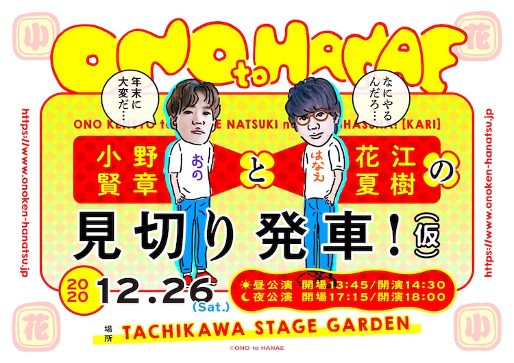 12月26日に立川市・TACHIKAWA STAGE GARDENにて開催されるイベント「小野賢章と花江夏樹の見切り発車!(仮)」の観覧チケット完売に伴い、Streaming+とあにてれにて、昼夜両公演を生配信することが決定した。