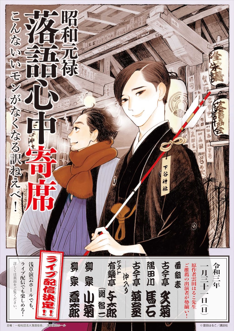 また柳家喬太郎をはじめとした、雲田イチオシの出演者が勢揃いする「昭和元禄落語心中寄席」には、特別ゲストとしてアニメ「昭和元禄落語心中」で有楽亭与太郎役を演じた関智一も出演。より多くの人に楽しんでもらえるようにと、公演だけでなくライブ配信と後日のアーカイブ配信も行われる。チケットは1月9日10時に販売開始。