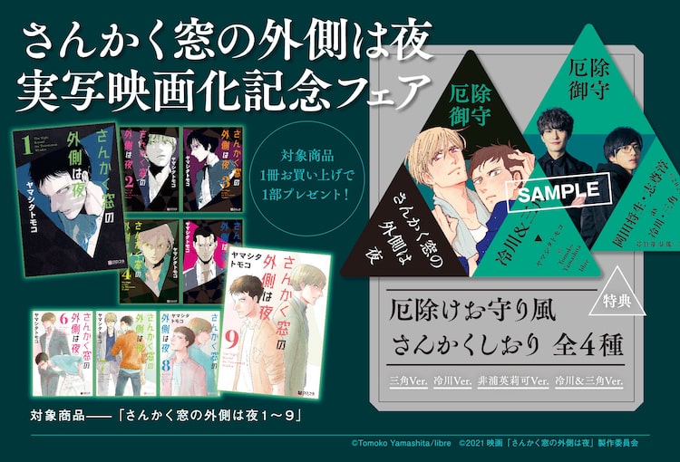 対象の店舗では「さんかく窓の外側は夜」1巻から9巻までの単行本を1冊購入するごとに、特典として「厄除けお守り風さんかくしおり」1枚がもらえる。しおりは「冷川Ver.」「三角Ver.」「非浦英莉可Ver.」「冷川&三角Ver.」の4種類で、それぞれに原作の冷川たちと、岡田将生ら扮する実写映画版の冷川たちがデザインされた。なくなり次第、配布は終了するため、欲しい人はお早めに。