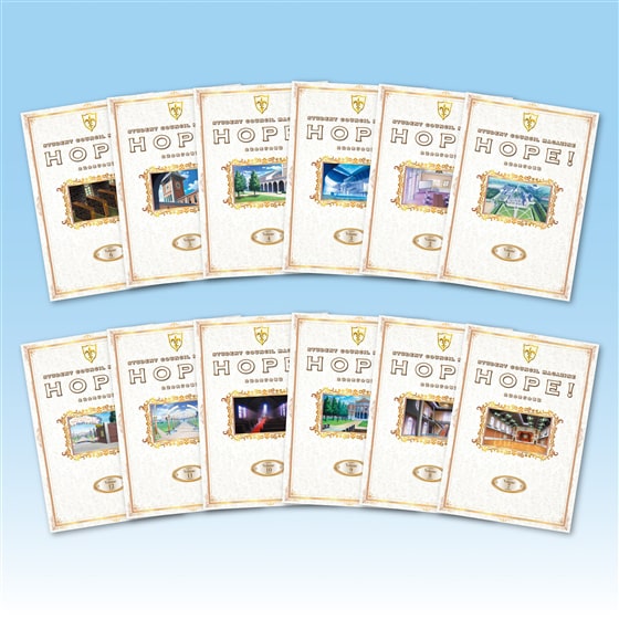 アッシュフォード学園生徒会による会報誌というコンセプトで作成される「生徒会報HOPE!~生徒会発行学園誌~」。約1年をかけ、月刊で全12巻が発売される。同誌には描き下ろしイラストが多数掲載されるほか、オリジナルストーリーを展開。第1巻には書き下ろしストーリー「巻頭特集 実録!生徒会報編集会議!」と書き下ろしのインタビュー風記事「生徒会に聞く! 第1回・副会長ルルーシュ・ランペルージ」、ルルーシュを隠し撮りしたような描き下ろしイラスト「生徒会写真館」が収録される。