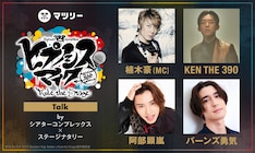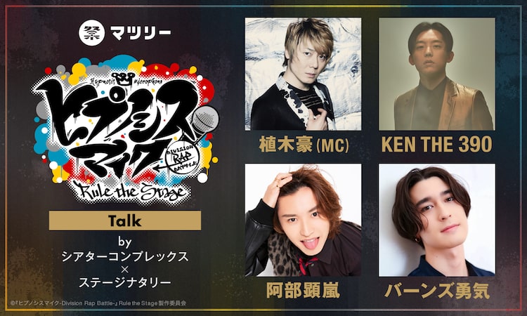 音楽、マンガ・アニメ、お笑い、映画、舞台の情報を紹介するニュースサイト・ナタリーが、“ポップカルチャーのお祭り”をテーマに実施する「マツリー」。トークイベントでは舞台「ヒプマイ」の演出を手がける植木豪がMCを担当し、ヨコハマ・ディビジョン”MAD TRIGGER CREW”に属する碧棺左馬刻役の阿部顕嵐、毒島メイソン理鶯役のバーンズ勇気、「『ヒプノシスマイク-Division Rap Battle-』Rule the Stage -track.4-」の音楽監督を務めるラッパーのKEN THE 390が同舞台の“あるある”やお気に入りの楽曲について語る。