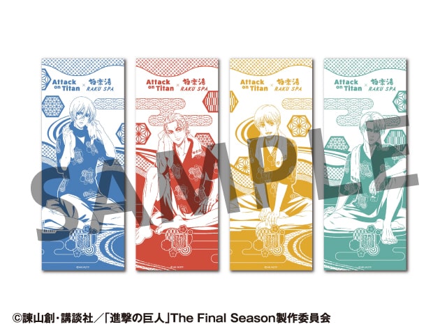 店舗のフロントではミカサ、アルミン、エレン、リヴァイの描き下ろしイラストを使用した手ぬぐい全4種からランダムで1枚が付いてくる「お風呂の民セット」を販売。また極楽湯の公式Twitter(@gokurakuyu_spa)をフォローしてコラボにまつわる写真を投稿しフロントで提示すると、ポストカードがもらえる。