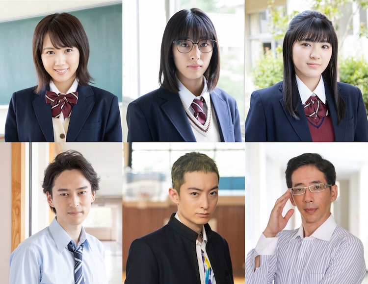 上段左から永島聖羅扮する飯倉智花、仁科かりん扮する慎大寺珠美、平川結月扮する奥沼民子。下段左から山本直寛扮する樫沢光輝、濱正悟扮する北沼、野間口徹扮する縦島洋。 (c)西森博之/小学館 (c)「お茶にごす。」製作委員会