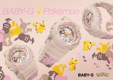 BABY-Gは25周年を迎えた2019年にも、ポケモン図鑑におけるピカチュウの図鑑番号が“025”である縁から、ピカチュウとのコラボモデルを発表している。第2弾となる今回の「BA-110PKC」はアナログとデジタルのコンビネーションモデルで、アウトドアをテーマにピカチュウのシルエットでカモフラージュ柄を表現。ボディはピンクベージュが基調で、バンドには尻尾がハート形のメスのピカチュウがデザインされた。またフェイス部分の時分針はピカチュウの顔を表現。遊環にはハート形の尻尾があしらわれ、裏蓋にはピカチュウのイラストが刻印されている。パッケージもモンスターボールをモチーフにした特別仕様で用意された。価格は税込1万9800円。