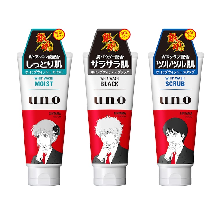 今回の「銀魂」とンズスキンケアブランド「ウーノ」によるコラボレーションは、“普段はコミカルなのに決めるときには決める”という「銀魂」のキャラクターたちが、「ウーノ」が理想とする“余裕を感じるカッコいい人物像”と重なり、さらに「ウーノ」愛用者に「銀魂」のファンが多いことから展開されたもの。「ウーノ ホイップウォッシュ」には銀時、新八、神楽の3人がそれぞれ「ウーノ」の世界観でクールに決める姿がプリントされた。サラサラ肌に洗い上げる「ウーノ ホイップウォッシュ(ブラック)銀時」、毛穴汚れを落としツルツル肌に洗い上げる「ウーノ ホイップウォッシュ(スクラブ)新八」、うるおいを保ちながら肌をスッキリさせる「ウーノ ホイップウォッシュ(モイスト)神楽」の3種が用意されているので、ファンは気になる商品を手にしてみては。