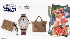 ラインナップされたのは腕時計・バッグ・財布の3アイテム。ブルーウォーターをイメージしたストーンが12時の位置に配置された腕時計は、盤面にナディアたちが目指したヨーロッパ・アフリカ周辺の海図がデザインされたシックな仕上がりに。ボディの側面に同じく海図が型押しされたショルダートートバッグには、ブルーウォーターをイメージした取り外しできるチャームが添えられた。また二つ折り財布のカードポケットには、ナディアの髪色と金のアクセサリーを彷彿させる切り替えがあしらわれた。二つ折り財布にもブルーウォーターをイメージしたチャームが付属する。
