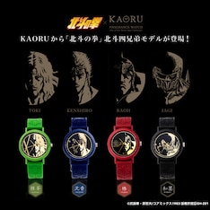 「KAORU」は特殊加工によって、シリコン素材のベルトに香りが施された腕時計。コラボモデルは、ケンシロウ、ラオウ、トキ、ジャギをイメージした4種が用意された。ブルーのケンシロウモデルには沈香の香り、レッドのラオウモデルには海外から“日本のバラ”と称された椿の香り、グリーンのトキモデルには落ち着いた爽やかな抹茶の香り、ブラックのジャギモデルには和墨の香りを使用。文字盤には各キャラクターのイラストも描かれた。北斗四兄弟の名セリフをあしらったブック型パッケージ入りで届けられる。