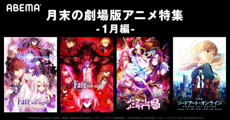 今回“寒い冬の日に見たい劇場アニメ作品”として選ばれたのは4作品。1月29日に「ノーゲーム・ノーライフ ゼロ」、1月30日に劇場版「『Fate/stay night [Heaven’s Feel]』I.presage flower」、劇場版「『Fate/stay night [Heaven’s Feel]』II.lost butterfly」の2作品、2月6日に「劇場版 ソードアート・オンライン -オーディナル・スケール-」が配信される。なお、各作品とも配信後1週間はABEMAビデオにて無料で視聴することができる。