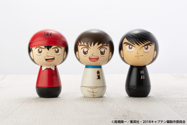こけし化されたのは大空翼、若林源三、日向小次郎の3キャラクター。群馬県榛名山の東麓にある榛東村に工房を構える、1950年創業・卯三郎こけしの職人が、天然木の温かみある木目を活かしながら、各キャラクターの顔やユニフォームなどを、1つひとつ手仕事により丁寧に塗り分けて表現している。