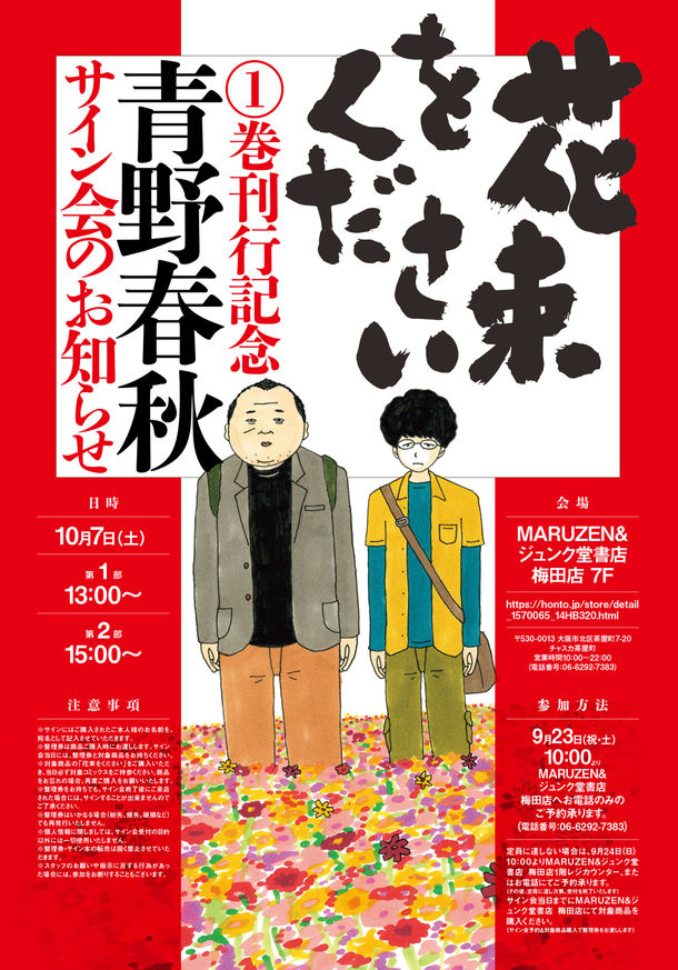 なおMARUZEN&ジュンク堂書店梅田店では、1巻の発売を記念して10月7日に青野のサイン会を開催。参加希望者は電話にて予約の上、店頭で「花束をください」1巻を購入しよう。予約受付は9月23日10時よりスタート。