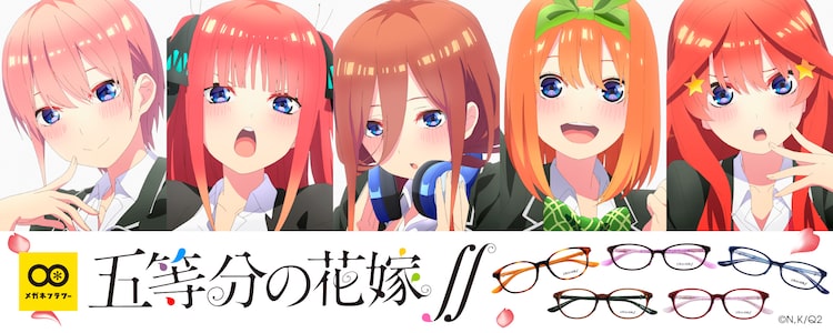 春場ねぎ原作によるTVアニメ「五等分の花嫁∬」とメガネフラワーのコラボ眼鏡フレームが、メガネフラワーのオンラインショップ、楽天市場、Yahoo!ショッピング、Amazon.co.jpで販売されている。
