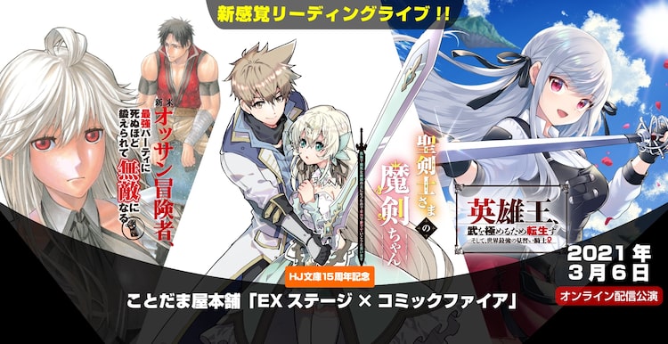 「EXステージ×コミックファイア」は2部制で、くろむら基人「英雄王、武を極めるため転生す ~そして、世界最強の見習い騎士♀~」、荻野ケン「新米オッサン冒険者、最強パーティに死ぬほど鍛えられて無敵になる。」、おおのいも「聖剣士さまの魔剣ちゃん ~孤独で健気な魔剣の主になったので全力で愛でていこうと思います~」を、マンガを動かす形で映像化。生アテレコに挑むキャストには、佐藤拓也、藤井ゆきよ、生天目仁美らが名を連ねている。チケットはOPENREC.tvの特設ページで販売中だ。