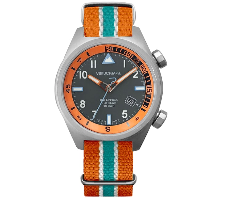 ラインナップされたのは「ゆるキャン△2021モデル」と、376本限定の「志摩リンモデル」。どちらも自衛隊用の時計を製造・販売しているケンテックスジャパンの技術を活かした、キャンプに役立つ10気圧防水のソーラーウォッチだ。インナーベゼルには方位計を実装。ガラスには傷がつきにくく透明度の高いサファイアクリスタルが採用され、設置作業が多いキャンプ中も安心して使うことができる。また12時のインデックスには「ゆるキャン△」のロゴが使われ、針はカラビナやペグを模した形状に。側面のリューズには方位のマークとテントのマークがデザインされている。