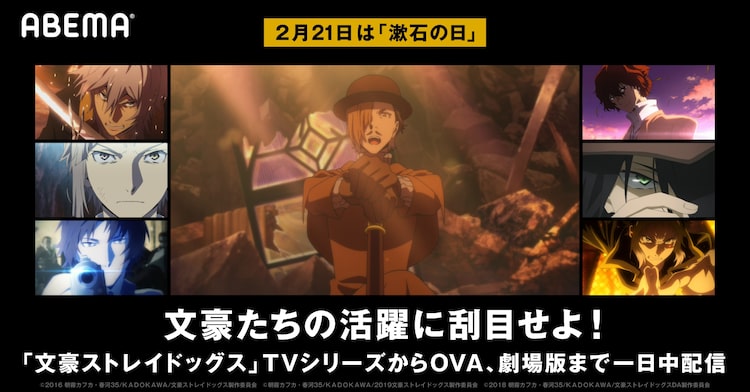 朝霧カフカ春河35原作によるアニメ「文豪ストレイドッグス」のTVシリーズ、OVA、映画が、“漱石の日”として知られる2月21日にABEMAのアニメ LIVE チャンネルにて一挙配信される。