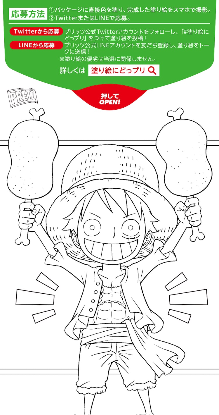 さらにプリッツの公式Twitter(@PretzJP)では、抽選で20人に「ONE PIECE 塗り絵プリッツコンプリート BOX」が当たるキャンペーンを実施中。本日2月22日から3月1日までの期間に同アカウントをフォローして、キャンペーンツイートをリツイートすると応募が完了する。