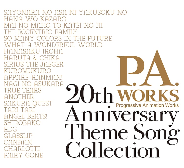 P.A.WORKSが過去に制作してきた作品のオープニングおよびエンディング主題歌を網羅したアルバム「P.A.WORKS 20th Anniversary Theme Song Collection」が、3月17日にリリースされる。