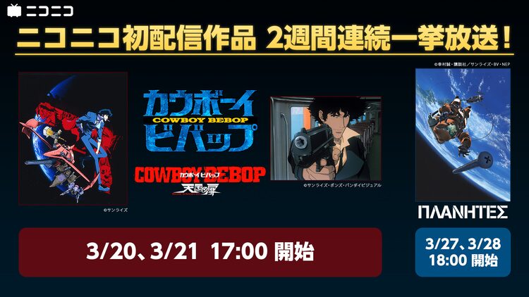 TVアニメ「カウボーイビバップ」、劇場アニメ「カウボーイビバップ 天国の扉」、幸村誠原作によるTVアニメ「プラネテス」が、ニコニコ生放送にて一挙放送される。