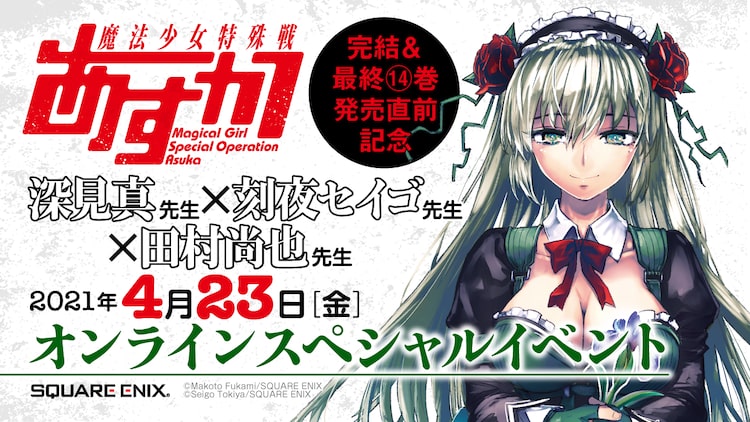 深見真原作、刻夜セイゴ作画、田村尚也軍事設定協力による「魔法少女特殊戦あすか」の完結と最終14巻の発売を記念し、4月23日19時より、著者3人が出演するオンラインイベントがYouTubeのスクウェア・エニックスチャンネルで配信される。