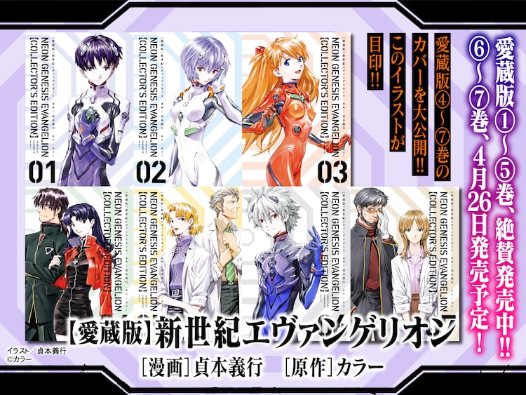 貞本義行「【愛蔵版】新世紀エヴァンゲリオン」4巻、5巻が本日3月26日に同時発売。これに合わせて4月26日に6巻と同時発売される最終7巻のカバービジュアル、4巻と6巻に付属するイラスト集の一部内容が公開された。