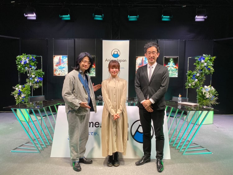 「AnimeJapan 2021」内で行われたTVアニメ「Vivy -Fluorite Eye's Song-(ヴィヴィ -フローライトアイズソング-)」ステージより。左から福山潤、種崎敦美、高橋祐馬プロデューサー。