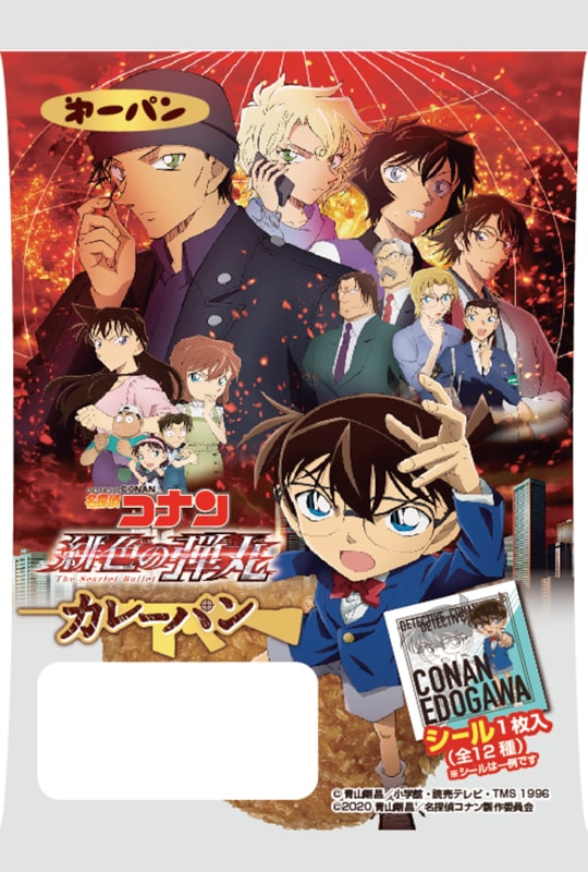 ラインナップされたのは、4月16日に公開される劇場版「名探偵コナン 緋色の弾丸」のポスタービジュアルをパッケージに用いた「名探偵コナン カレーパン」と、赤井秀一をモチーフとした「名探偵コナン 赤井秀一のココアメロンパン チョコチップ入り」の2種。5月1日からは「名探偵コナン 羽田秀吉のチーズ蒸しケーキ」も追加で販売される。商品には「名探偵コナン 緋色の弾丸」やアニメに登場するキャラクターのシールが1枚封入。シールは全12種類用意されており、裏面にはキャラクターの名言などが掲載されている。