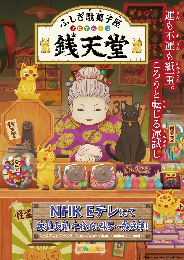 高木からは「工房の中をちょっと覗いてみる気分で、僕らが一生懸命作って生み出した駄菓子がどんな欲を持った人間に食べられ、どのような結果になっていくのかを見届けていただけたらと思っています」と、ファイルーズからは「金色の招き猫さんは、銭天堂の駄菓子を一生懸命作ったり、物語を明るく締めくくったりと、大事なお仕事をしています。幸運のお客様、とっても可愛い招き猫さんたちに、ぜひ癒されてください!」とコメントが到着。また4月からの新作放送に合わせ、YouTubeでは過去に放送された「ふしぎ駄菓子屋 銭天堂」の第1話「型ぬき人魚グミ」も配信された。