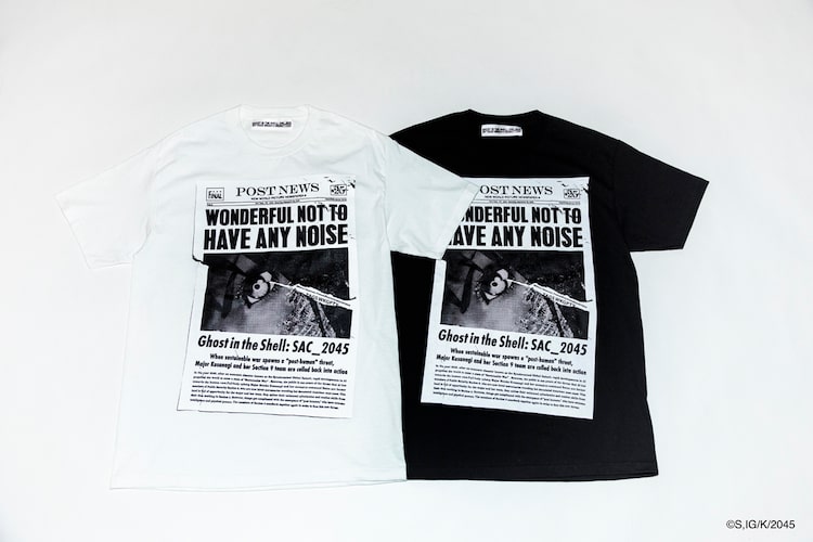 Tシャツのデザインは「POST NEWS」「NOISE」「Major」の3型。「POST NEWS」は2045年の新聞をテーマとし、新聞の切り抜きのようなプリントが施されている。「NOISE」はノイズによって破壊された言葉をモチーフに、さまざなま文字をグリッチアートという表現方法を用いてデザイン。「Major」は公安9課に属する草薙素子の姿が描かれた。