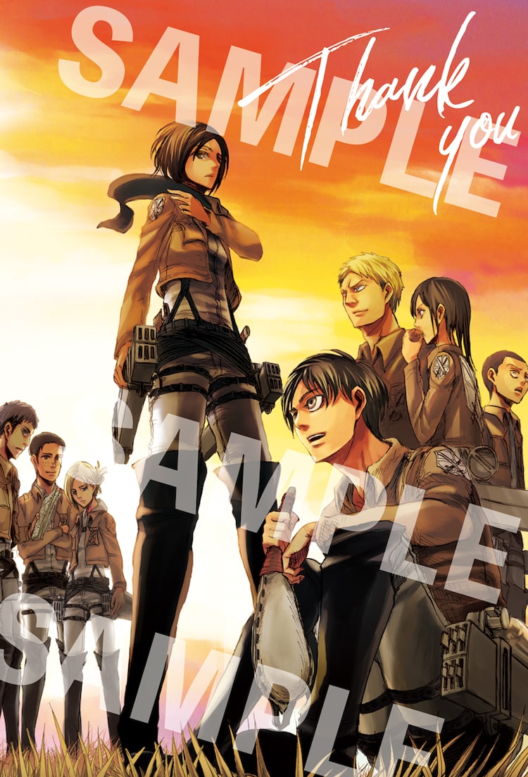 これは4月9日発売の別冊少年マガジン5月号にて、「進撃の巨人」が最終回を迎えることを記念したもの。ポストカードには「進撃の巨人」のキャラクターと共に、「Thank you for reading」の文字が添えられた。