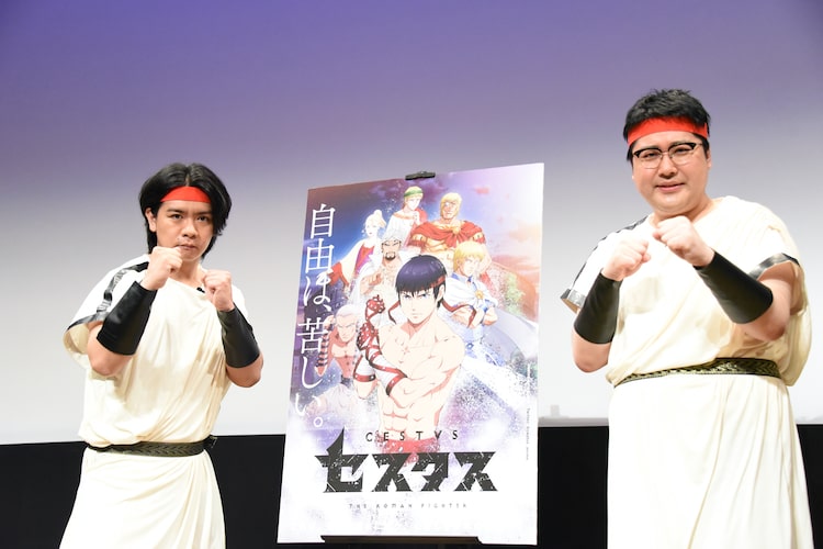 技来静也原作によるTVアニメ「セスタス -The Roman Fighter- (ザ・ローマン・ファイター)」のヒット祈願イベントが本日4月7日に行われ、マヂカルラブリーの野田クリスタルと村上が登壇した。
