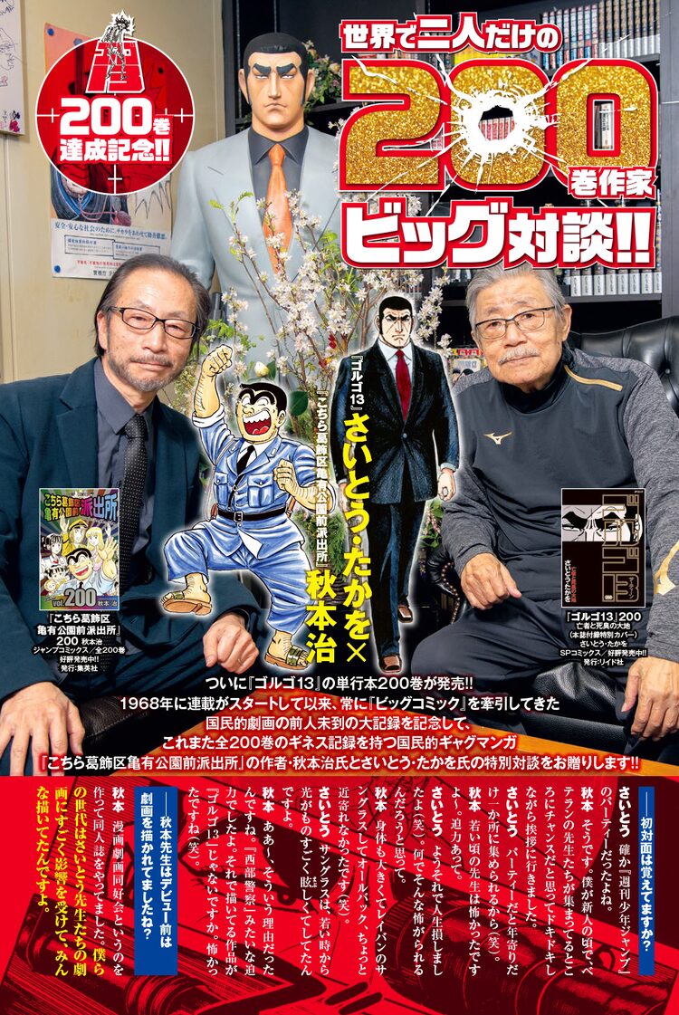 1968年11月にビッグコミックで連載がスタートし、去る4月5日に単行本の200巻目が発売された「ゴルゴ13」。今号にはさいとうと、2016年に「こちら葛飾区亀有公園前派出所」にて単行本200巻を突破し、「最も発行巻数が多い単一漫画シリーズ『Most volumes published for a single manga series』200巻」のギネス記録保持者である秋本治との対談が掲載された。また今号には巻頭カラーで「ゴルゴ13」が登場しているほか、描き下ろしイラストを使用した200巻の別カバーが付属している。さらに表紙は、さいとうもその出来栄えに「大満足」と太鼓判を押した、金子ナンペイによるゴルゴの肖像画が飾った。