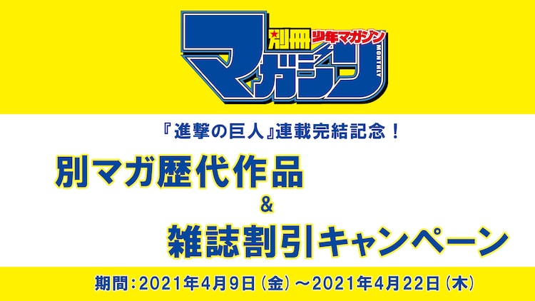 諫山創「進撃の巨人」が、4月9日発売の別冊少年マガジン5月号(講談社)で完結したことを記念し、「別マガ歴代作品および雑誌割引キャンペーン」が、全電子書店にて4月22日まで行われている。