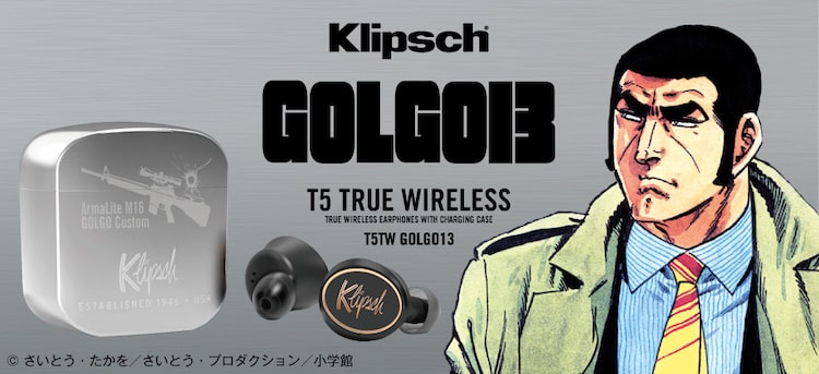 ワイヤレスイヤホンの本体には、Klipschブランドの「T5 TRUE WIRELESS」を採用。ケースの表側には銃口痕と「アーマライトM16 GOLGO Custom」、裏側にはロゴとデューク東郷のシルエットがデザインされている。また充電口にも、銃口痕に見立てた模様をレーザー加工で施した。商品は「ゴルゴ13」仕様のパッケージに入れて届けられる。