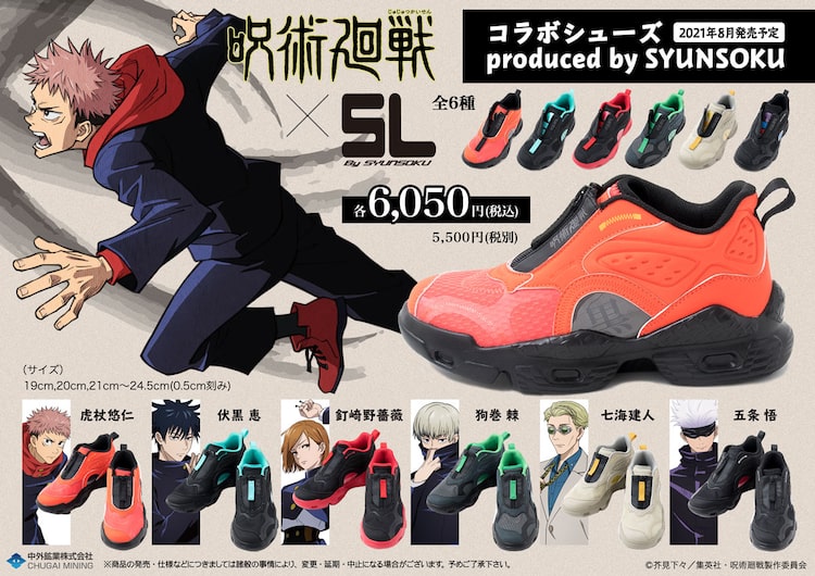芥見下々原作によるTVアニメ「呪術廻戦」と、アキレスによる子供向けシューズブランド「瞬足」シリーズの「SL by SYUNSOKU」とのコラボシューズが8月に発売される。