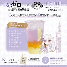 ドリンクは「エミリアのシトラスレモネード」「レムのブルーレモネード」「ラムのバルスストロベリー」「パックのクッキードゥ」「ベアトリスのフルーツティー」、そしてデリバリー専用商品「エキドナのバタークッキー牛乳」の6種類。「エキドナのバタークッキー牛乳」は一部店舗のみで取り扱う。またグッズとしてボトル、マスクケース、アクリルキーホルダー、ステッカー、クリアファイルがラインナップされた。各商品にはミニキャライラストがデザインされている。