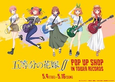 ポップアップショップでは今回のために描き下ろされた、ギターを持った中野家五つ子のイラストを使用したグッズを先行販売。またイベント限定の購入特典として、対象商品を税込2000円購入するごとにブロマイド全6種のうちランダムで1枚がプレゼントされる。実施店舗は秋葉原店、渋谷店、新宿店、苫小牧店、TOWERmini ダイバーシティ東京プラザ店、名古屋近鉄パッセ店、大高店、梅田NU茶屋町店。またタワーレコードオンラインでは本日4月23日18時に先行予約受付が開始される。なお秋葉原店では、描き下ろしイラスト5人の等身大パネルも設置される。