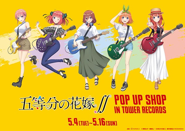 ポップアップショップでは今回のために描き下ろされた、ギターを持った中野家五つ子のイラストを使用したグッズを先行販売。またイベント限定の購入特典として、対象商品を税込2000円購入するごとにブロマイド全6種のうちランダムで1枚がプレゼントされる。実施店舗は秋葉原店、渋谷店、新宿店、苫小牧店、TOWERmini ダイバーシティ東京プラザ店、名古屋近鉄パッセ店、大高店、梅田NU茶屋町店。またタワーレコードオンラインでは本日4月23日18時に先行予約受付が開始される。なお秋葉原店では、描き下ろしイラスト5人の等身大パネルも設置される。