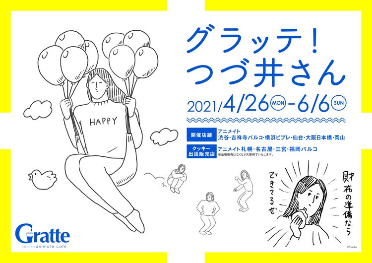また「グラッテ!つづ井さん」の開催店舗では、つづ井のサイン入りアクリルコースターが当たるキャンペーンを開催。欲しい人は対象商品を2000円分購入するごとにもらえる応募券をゲットしよう。なお緊急事態宣言における休業要請を受け、「グラッテ!つづ井さん」開催店舗のアニメイト吉祥寺パルコは臨時休業中。最新の営業状況については、アニメイトの公式サイトから確認を。