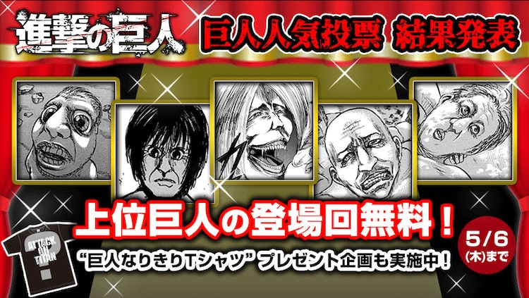 「“裏”人気投票企画」は、「進撃の巨人」に登場する巨人100体を対象とした人気投票。上位5位以内にランクインした巨人の登場話が、本日4月30日から5月6日23時59分までマガジンポケットにて無料公開されているのでチェックしてみよう。さらに1位を獲得した巨人がプリントされた「巨人なりきりTシャツ」を抽選で100人にプレゼント。応募方法はマガポケアプリの特設ページにて確認を。